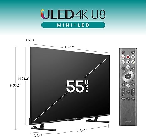 Hisense 55-Inch Class U8 Series Mini-LED ULED 4K UHD Google Smart TV (55U8N, 2024 Model) - QLED, Native 144Hz, Full Array Local Dimming, Game Mode Pro, Alexa Compatibility